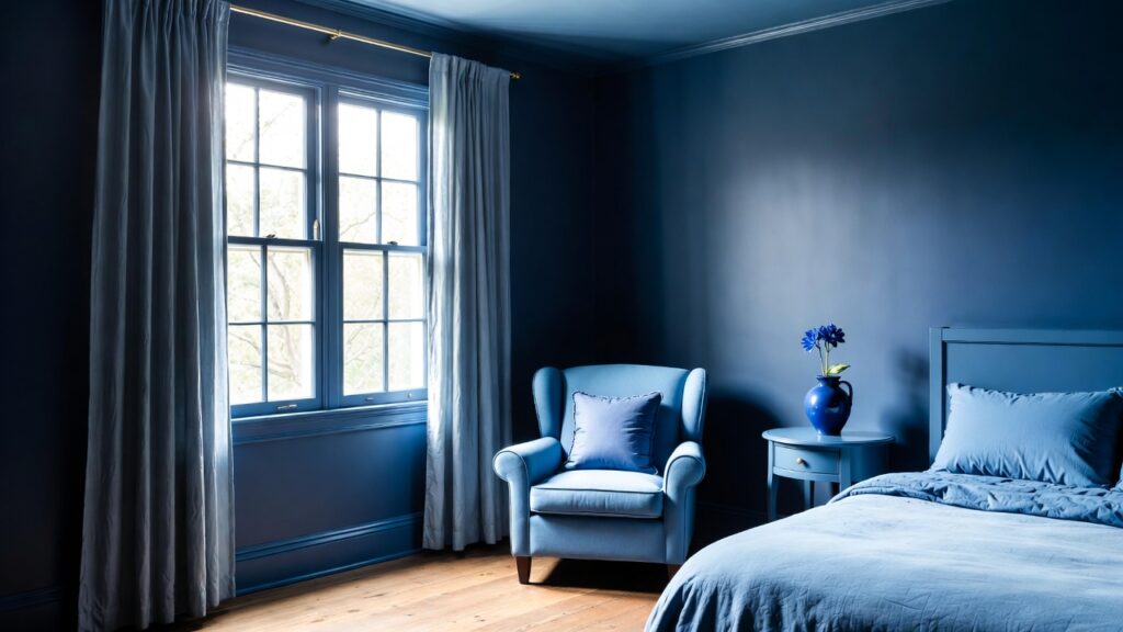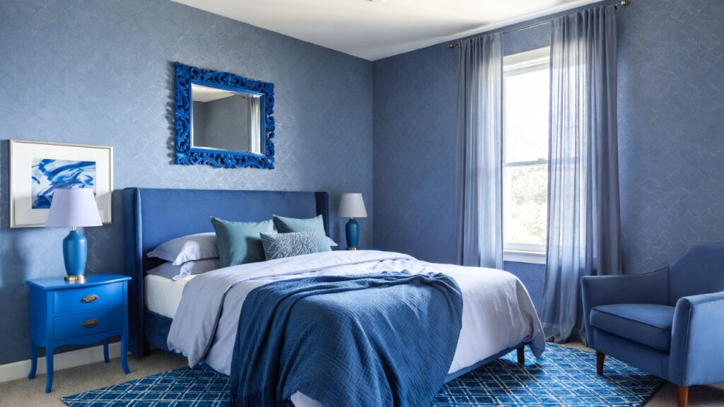 If painting the entire room feels too bold, go for one accent wall behind the bed. A navy or royal blue feature wall instantly becomes the focal point of the room. You can use matte paint, textured wallpaper, or wooden paneling painted blue to add depth and personality without overwhelming the space.