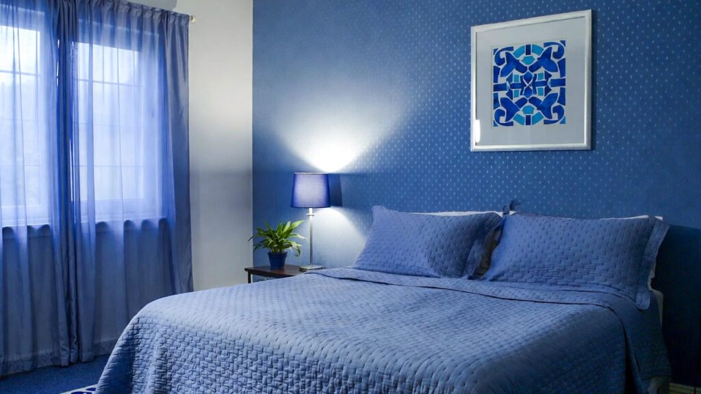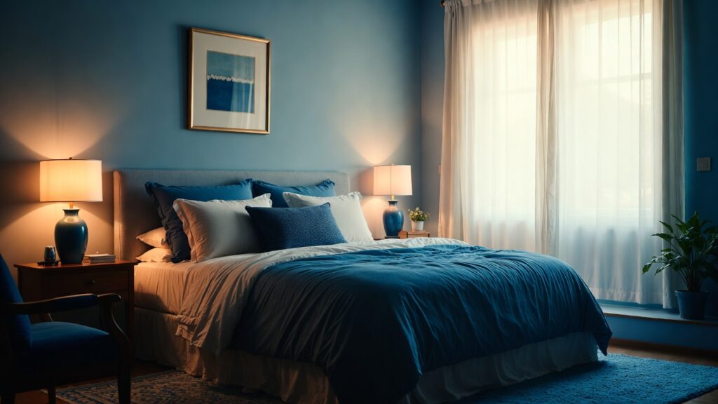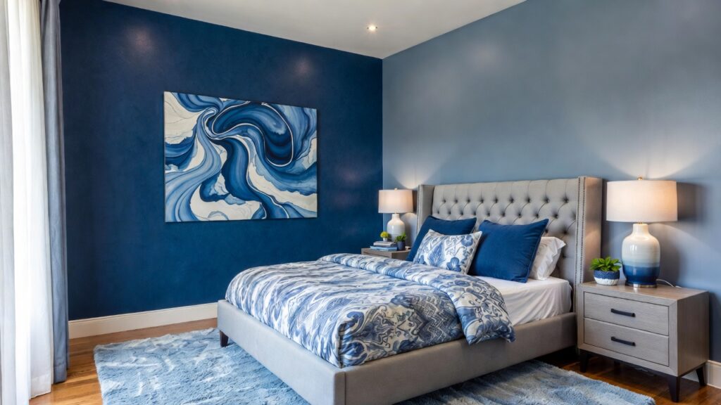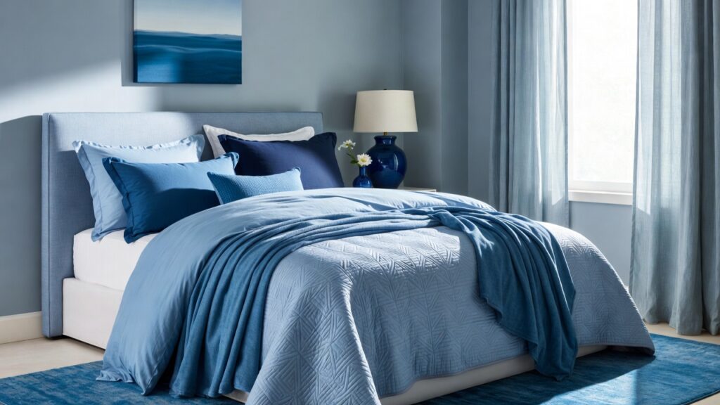 If you don’t want to paint your walls, introduce blue through fabrics. A navy duvet cover, soft blue throw pillows, and a textured blanket can transform a neutral bedroom instantly. Mixing materials like velvet, cotton, and linen adds depth and makes the room feel more inviting.