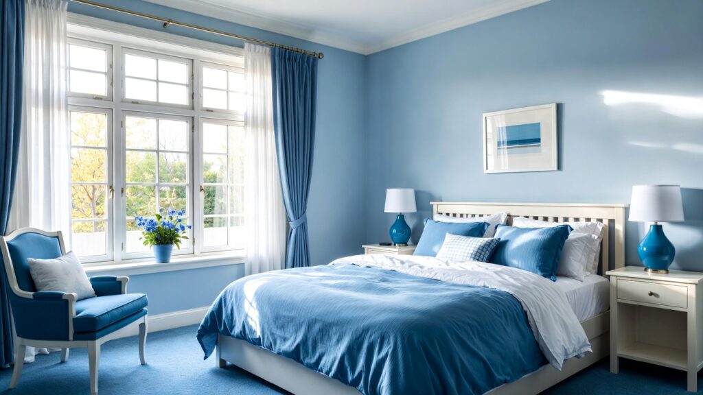 Blue and white is a timeless combination that always looks fresh and elegant. White bedding, curtains, and furniture help balance darker blue walls and keep the space bright. This combination works especially well in small bedrooms because it reflects more light and feels open.