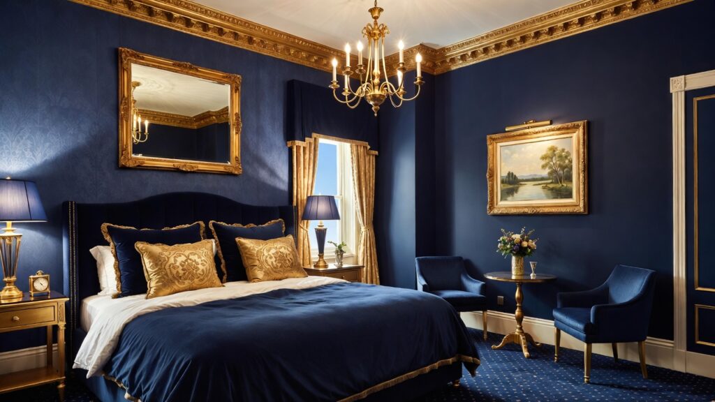 Metallic accents look stunning against blue backgrounds. Gold lamps, brass handles, or decorative trays add a touch of sophistication. This combination works especially well with darker blues, creating a rich and upscale bedroom aesthetic without too much effort.