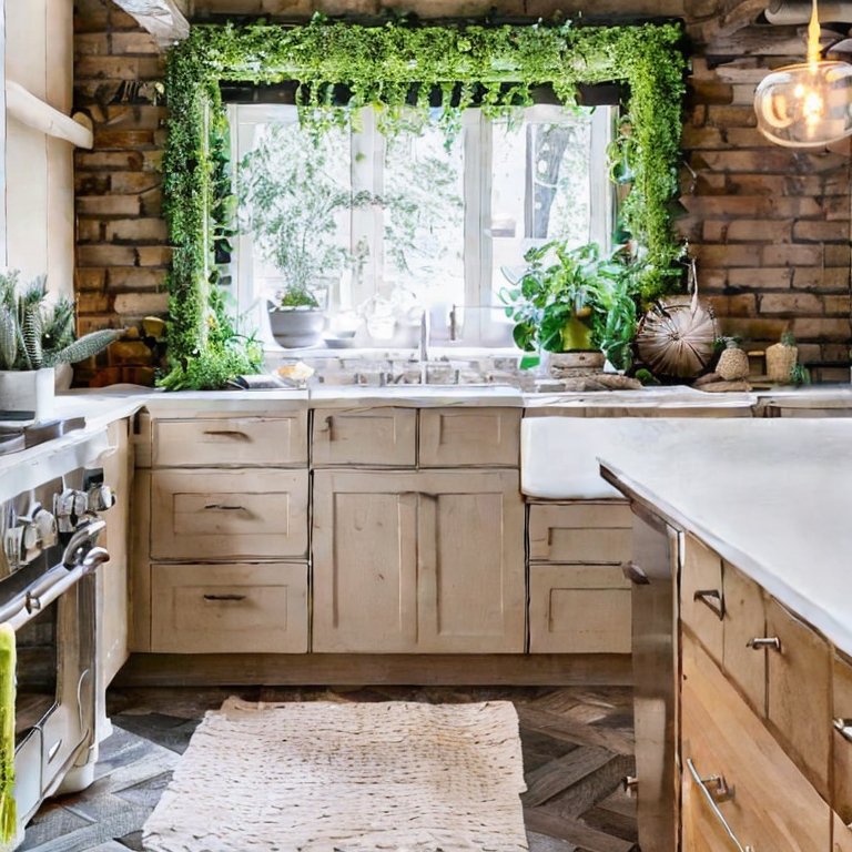 Adding natural materials brings warmth and balance to any kitchen. Wooden countertops, bamboo accessories, or rattan barstools soften modern spaces. Pair them with fresh greenery—like potted herbs on the windowsill, hanging plants, or a vase of seasonal flowers—for a refreshing, lively vibe.
