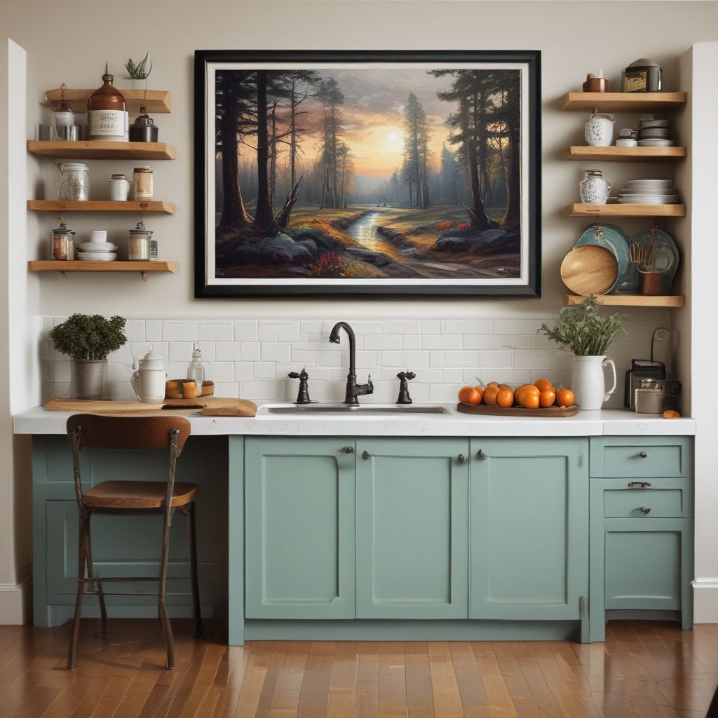 While it may seem unconventional to hang large-scale art in the kitchen, it’s actually a perfect way to inject style, color, and even humor into the space. An oversized piece of art can act as a centerpiece on a blank wall, especially in kitchens without upper cabinets or those with wide empty stretches of wall space.