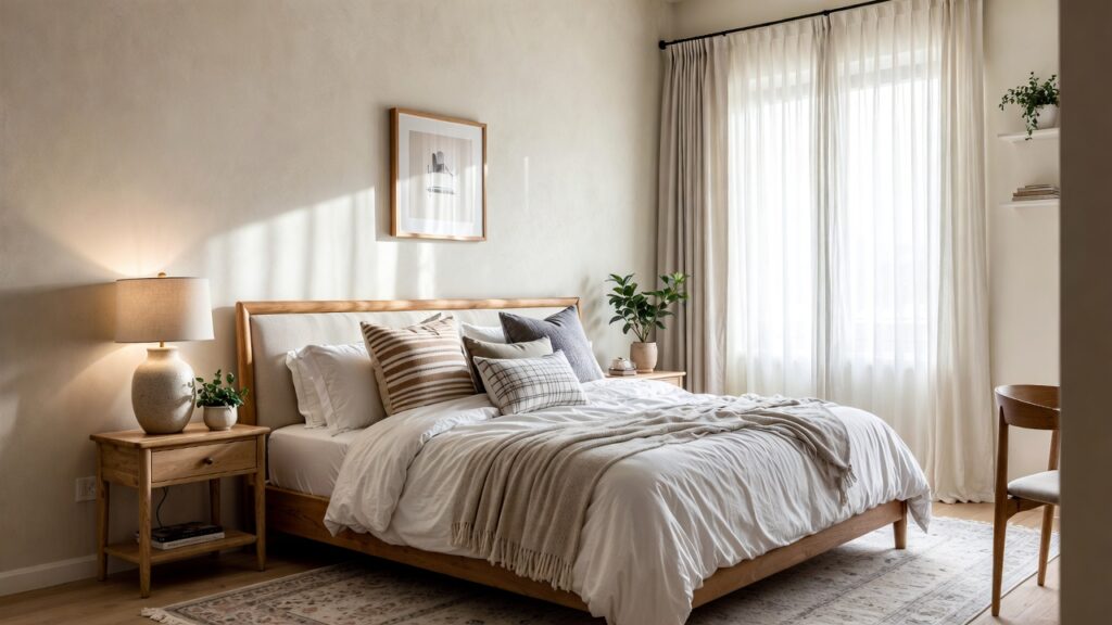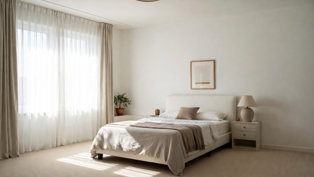 To avoid the room looking too plain, you can add small accents like textured pillows, a light throw blanket, or a subtle patterned rug. These details keep the room interesting while still maintaining the minimalist aesthetic.