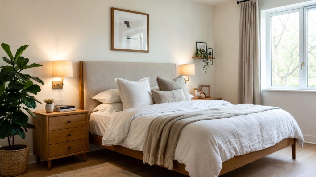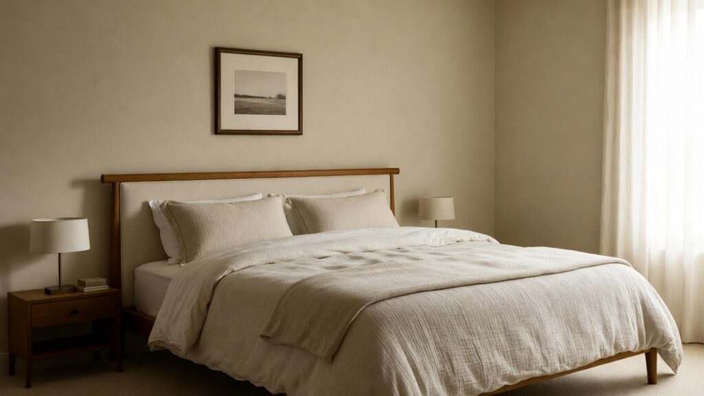 Opt for simple bedding in neutral tones such as white, light gray, or soft beige. Linen and cotton fabrics work especially well because they look natural and relaxed.