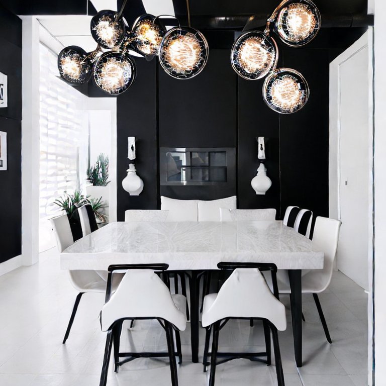 Lighting is key to enhancing black-and-white décor. Install bold chandeliers, pendant lights, or sculptural floor lamps in black or white finishes. A striking black chandelier above a white dining table or a sleek white pendant over a dark kitchen island creates instant sophistication.