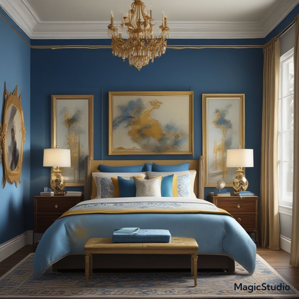 - Navy and white with tufted headboards, chandeliers, and gold details.