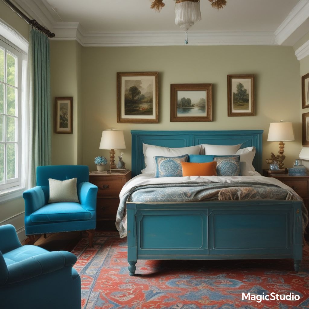 - Mixed blues with earthy tones, eclectic art, and layered textiles.