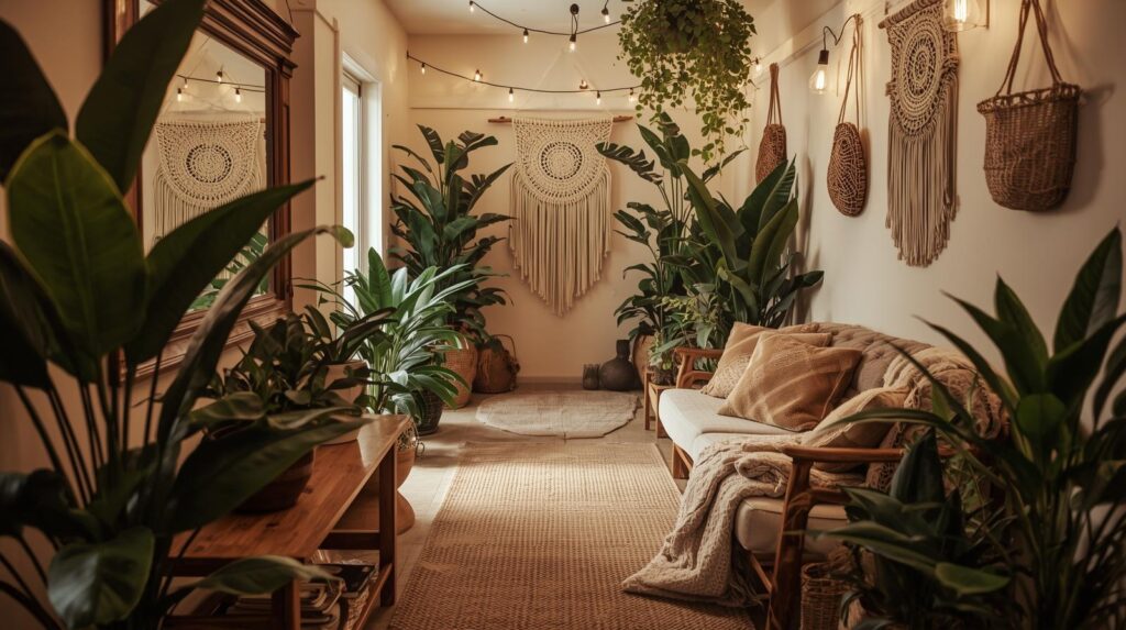 Choose low-maintenance plants like pothos, snake plants, or peace lilies for narrow spaces. Hanging macramé planters or rustic baskets can free up floor space while still enhancing that organic boho charm.