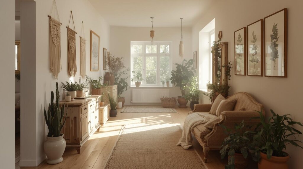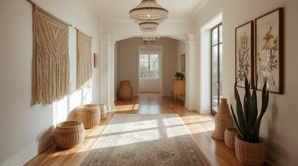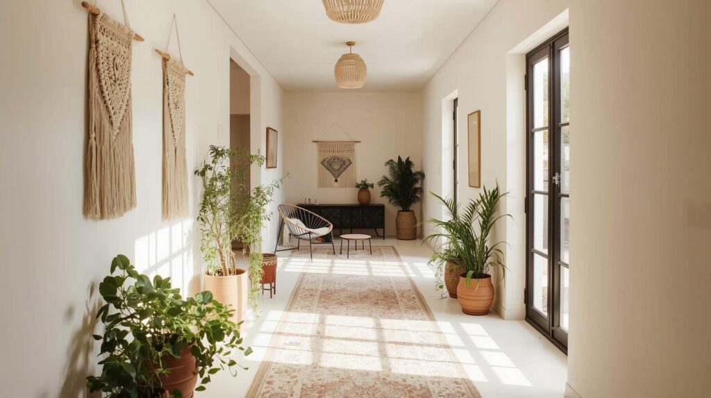 Bohemian design thrives on artistic expression and storytelling. Use your hallway walls as a canvas by displaying framed prints, macramé hangings, dreamcatchers, or even a gallery wall of family photos mixed with abstract art.