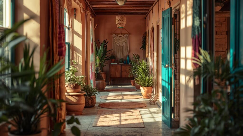 While neutral tones form the base of most boho interiors, hallways are the perfect place to experiment with pops of color. Incorporate mustard yellow, terracotta, deep teal, or burnt orange in textiles, artwork, and decorative accents.