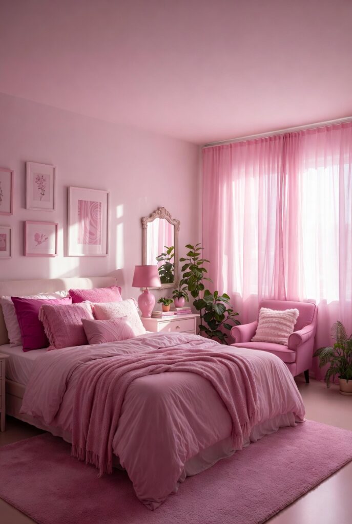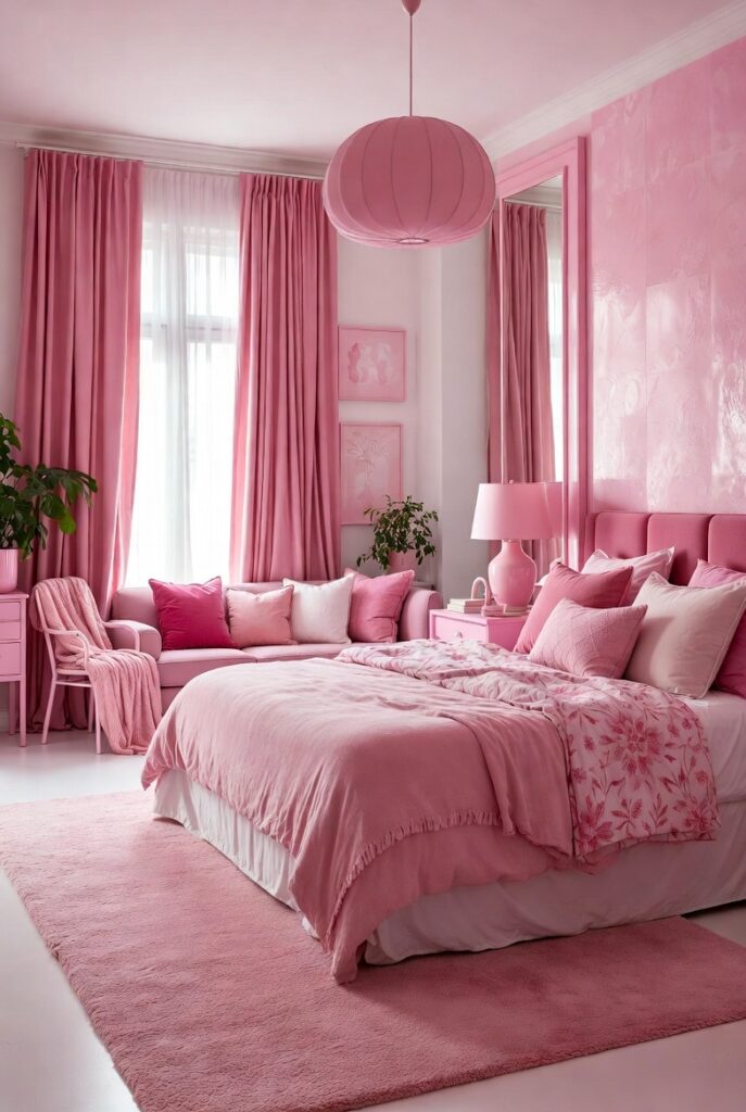 Textiles are essential for creating depth and comfort in a pink bedroom. Curtains in soft pink shades gently filter natural light and add an elegant softness to the space. Rugs with pink undertones help ground the room and connect different design elements.