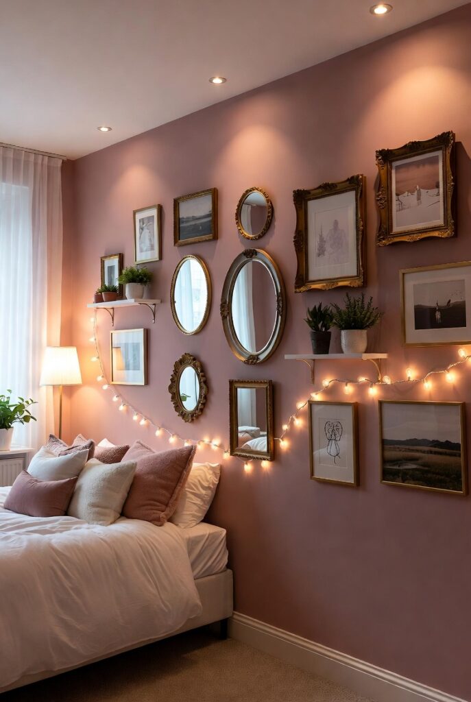 Mirrors with metallic or minimalist frames reflect light and make the room feel more spacious. Repeating pink accents across different decor elements creates a polished and intentional look rather than a scattered one.