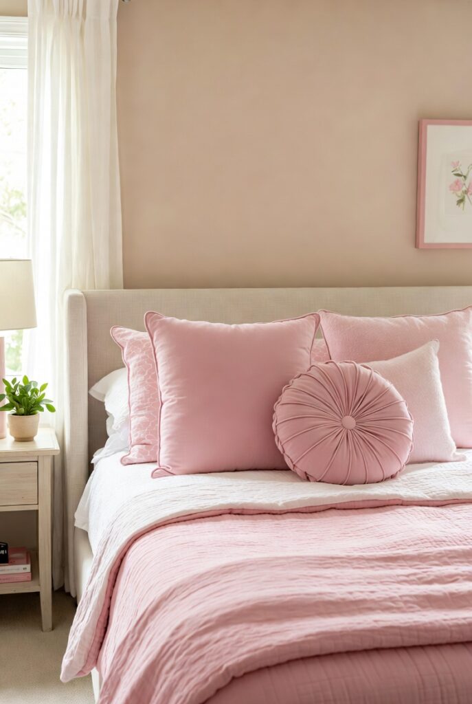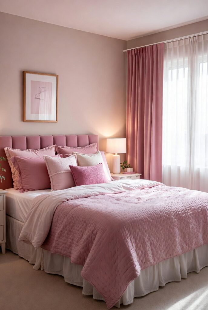 Texture plays a key role here. Mixing cotton sheets with velvet cushions or knitted throws adds depth and comfort. To prevent the bedding from feeling too dominant, balance pink elements with white, beige, or light gray accents. This approach keeps the bedroom inviting and visually harmonious.