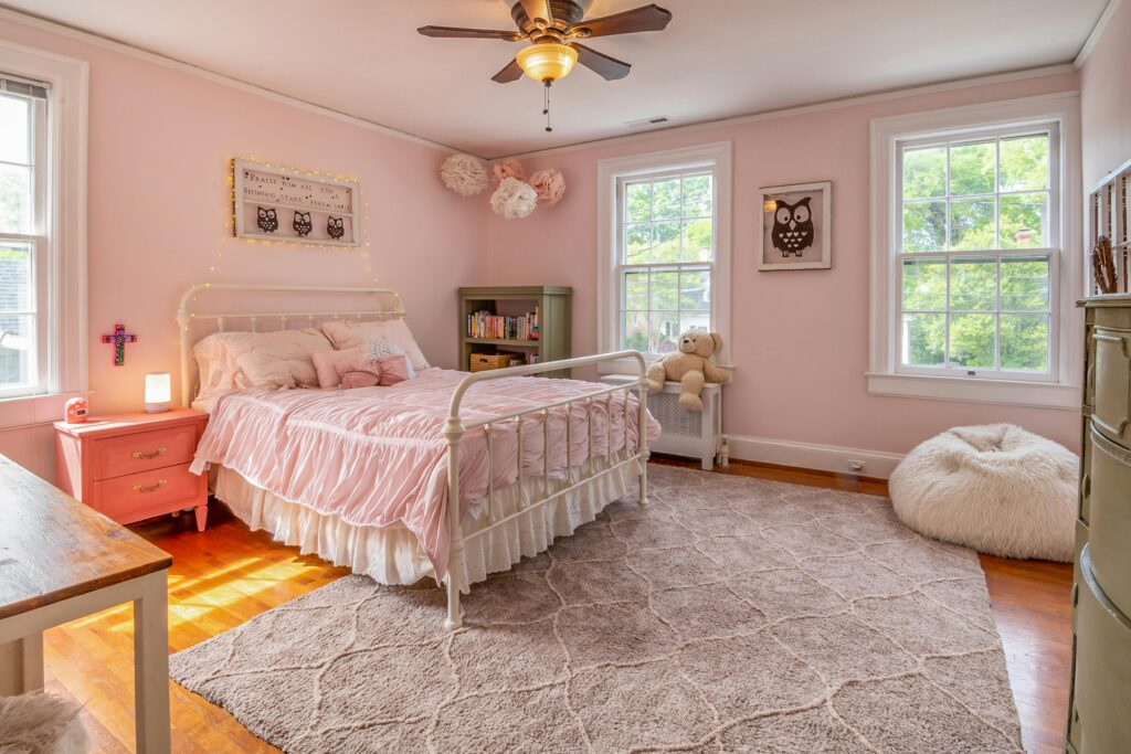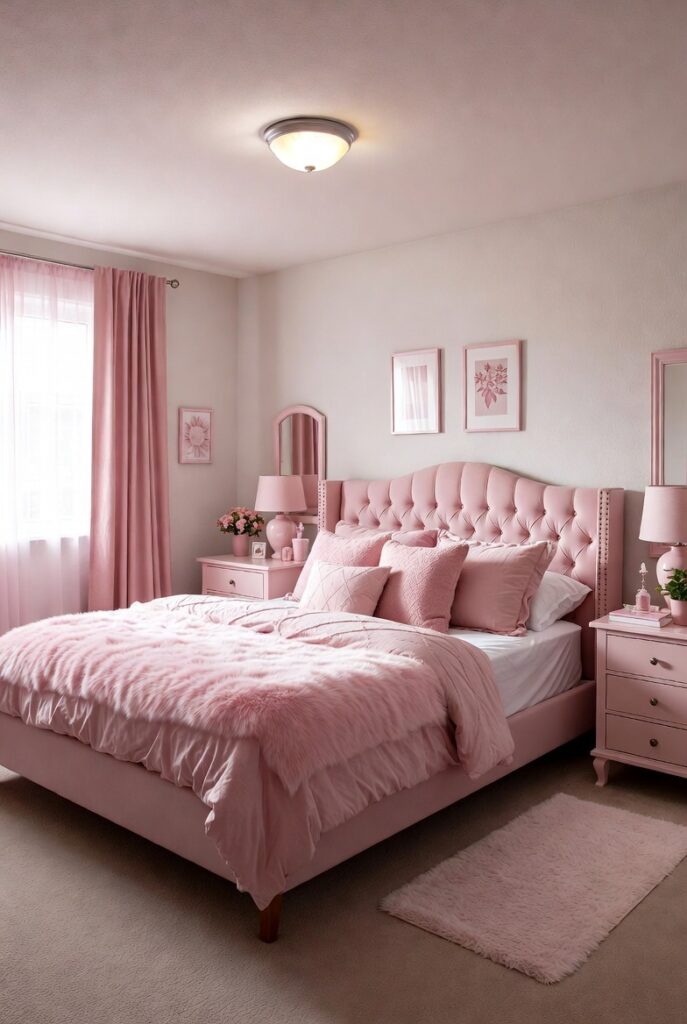 Furniture can add personality and charm to a pink bedroom when chosen carefully. A pink upholstered headboard serves as a stylish focal point without requiring bold wall colors. Accent chairs or benches in soft pink shades introduce color in a subtle yet impactful way.