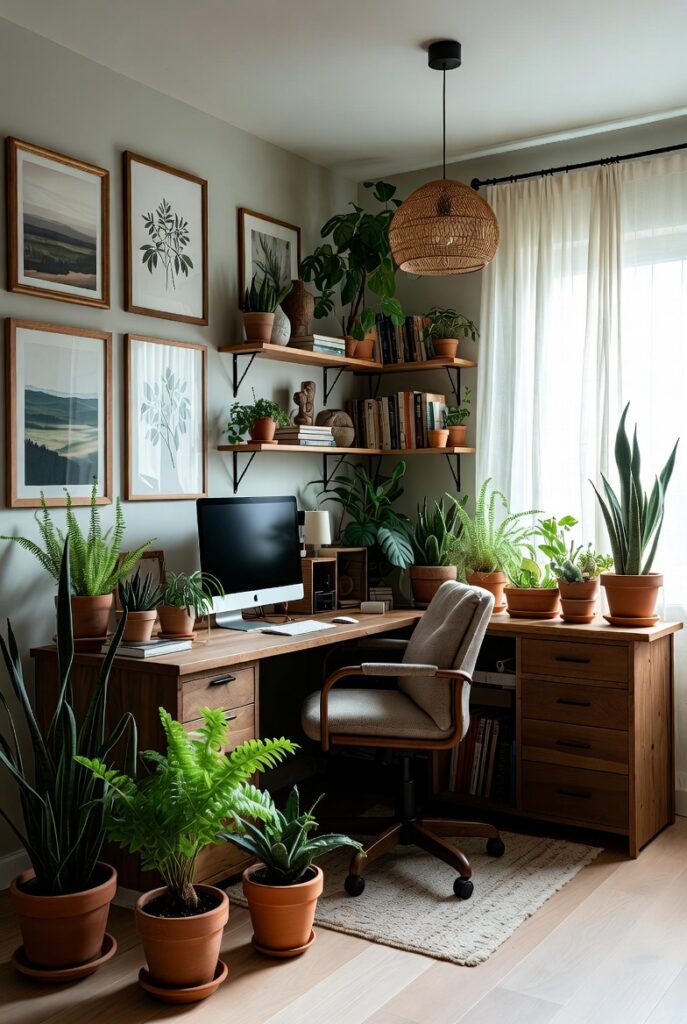 Plants bring life and freshness to a home office. Greenery improves air quality and creates a calming environment that helps reduce stress. Even small desk plants or hanging greenery can make a noticeable difference.